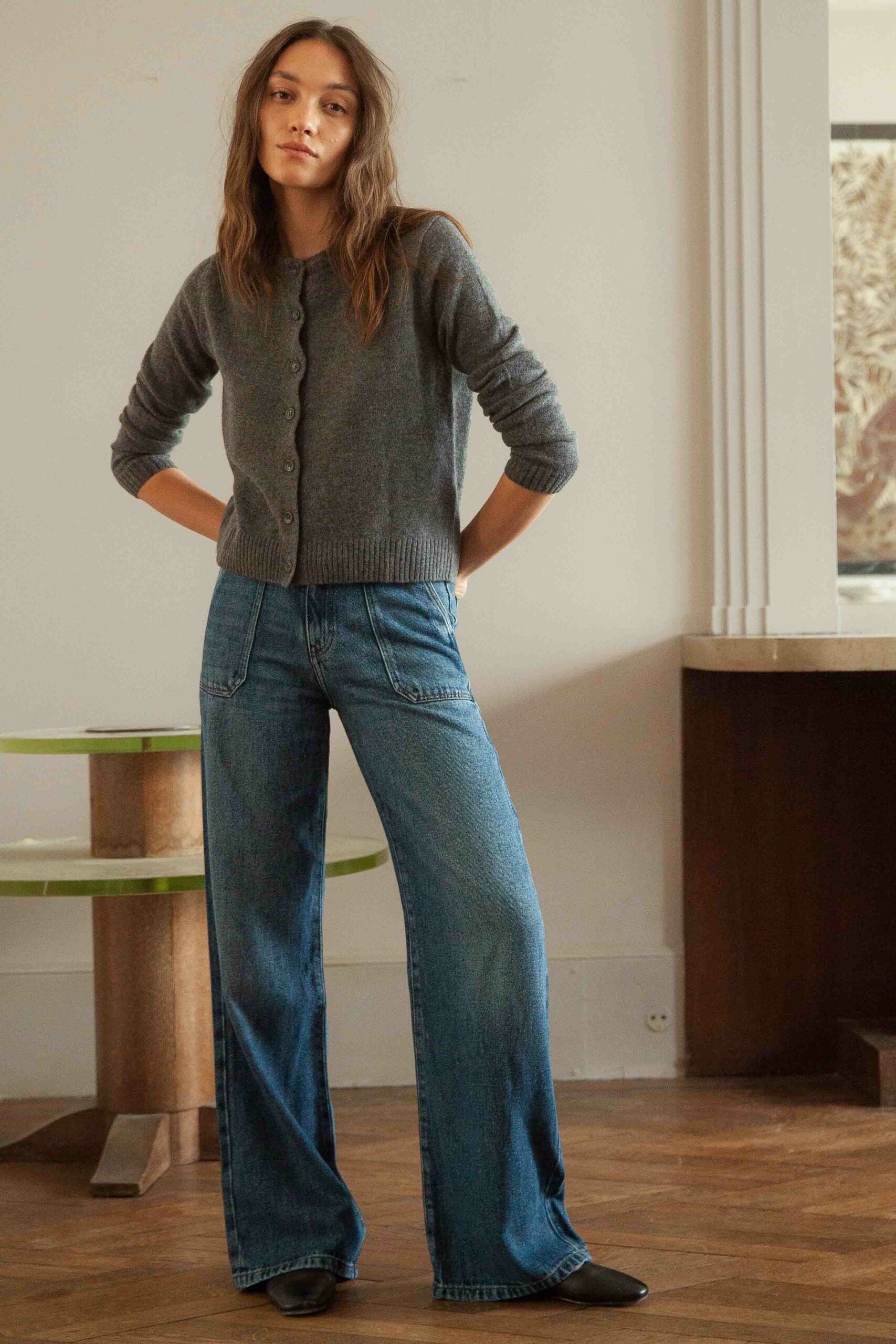 Pantalon long, coupe très large, taille haute, poches cargo.