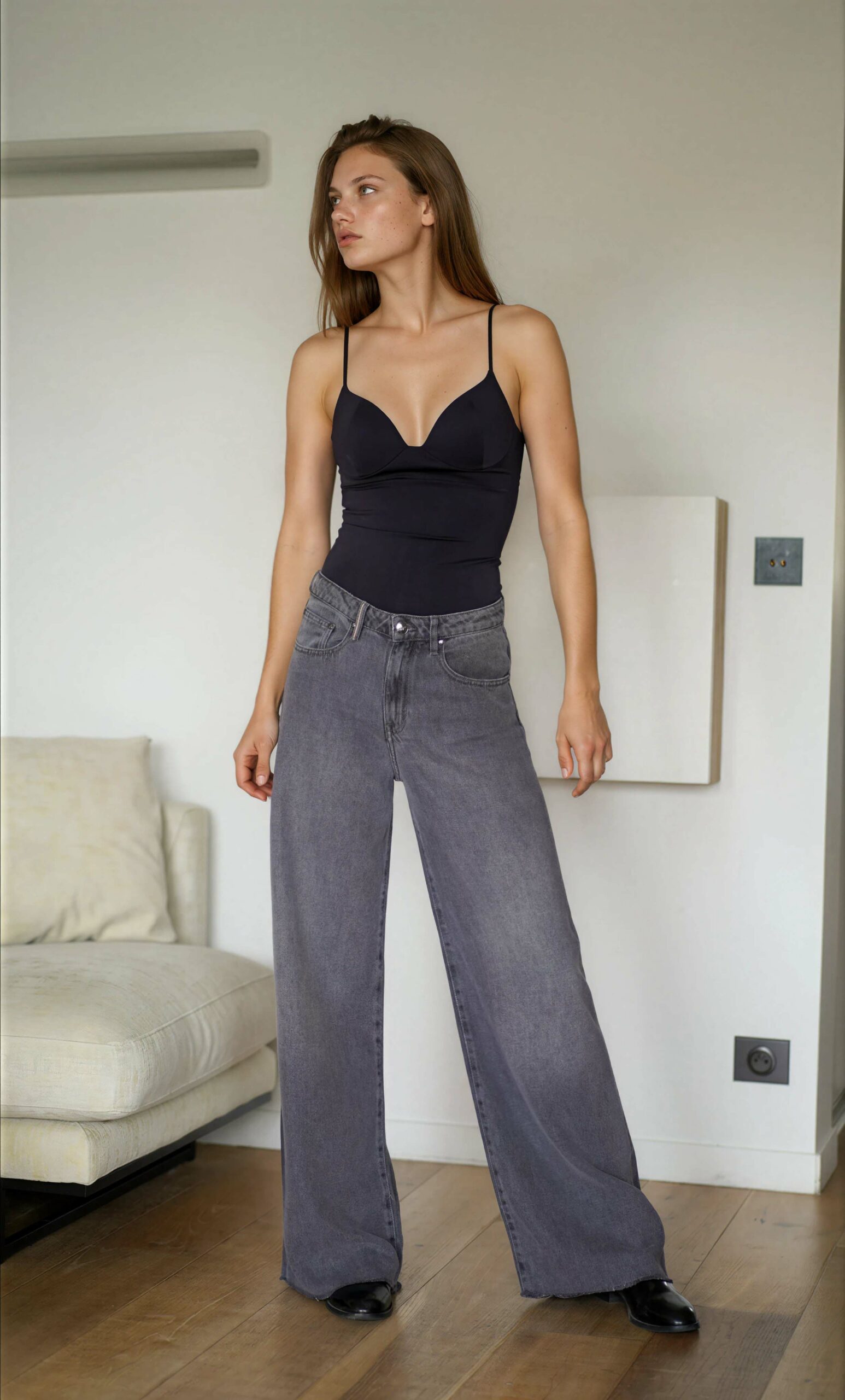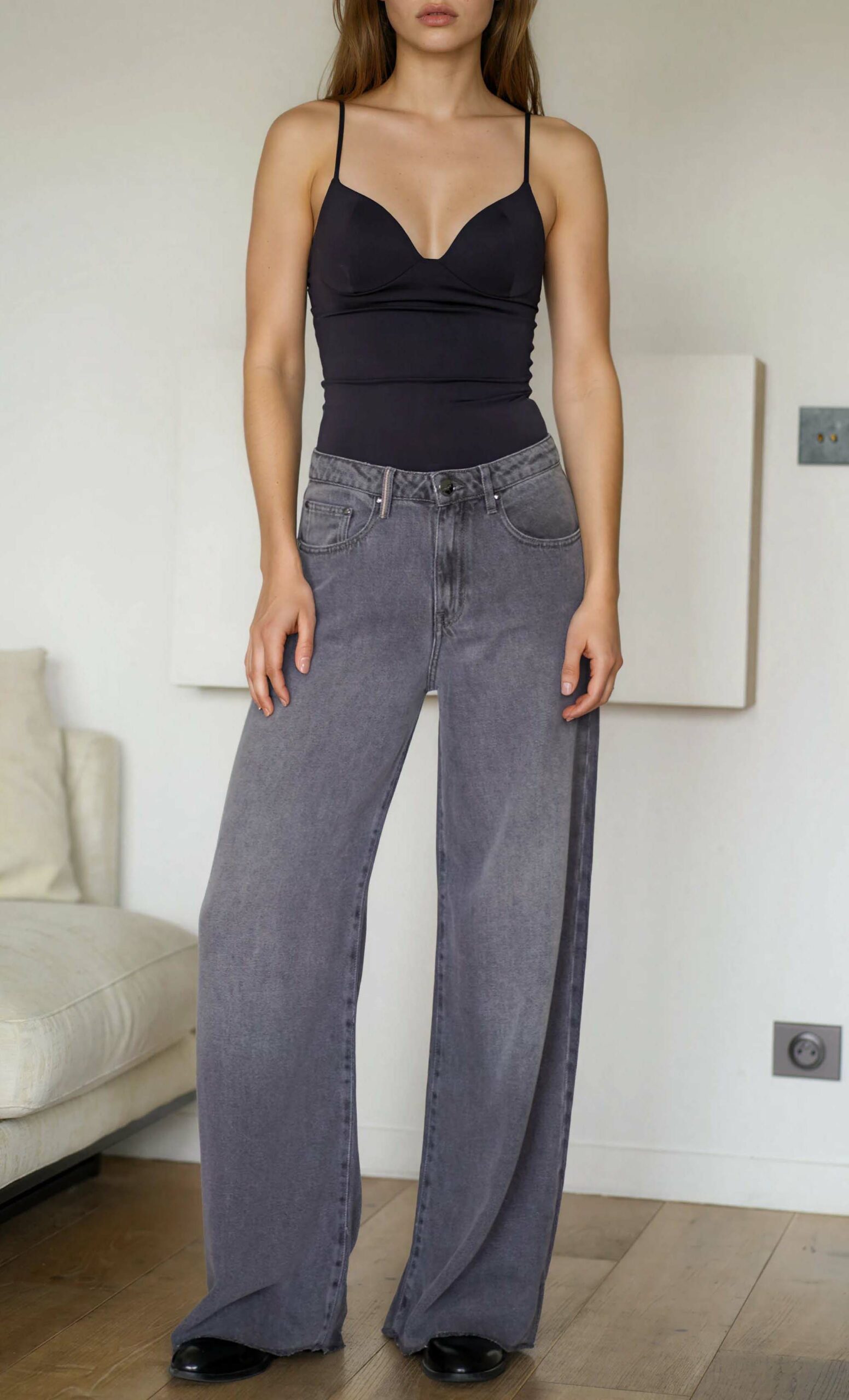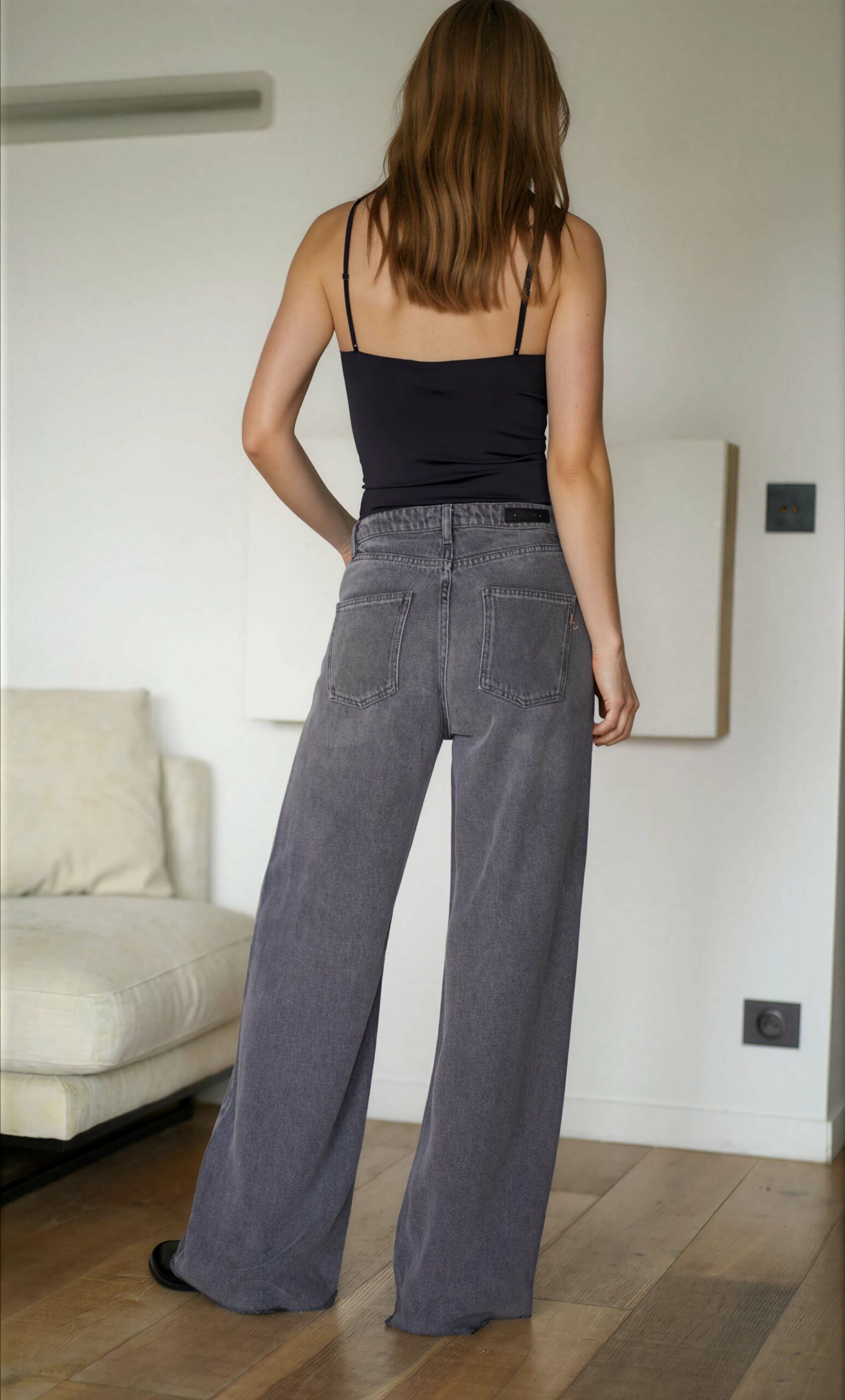 Pantalon long, coupe très large, taille haute, 5 poches.