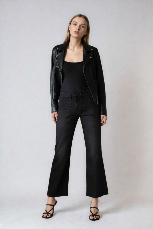 Jean coupe large, taille haute. Poches plaquées. Longueur entrejambe 72 cm.