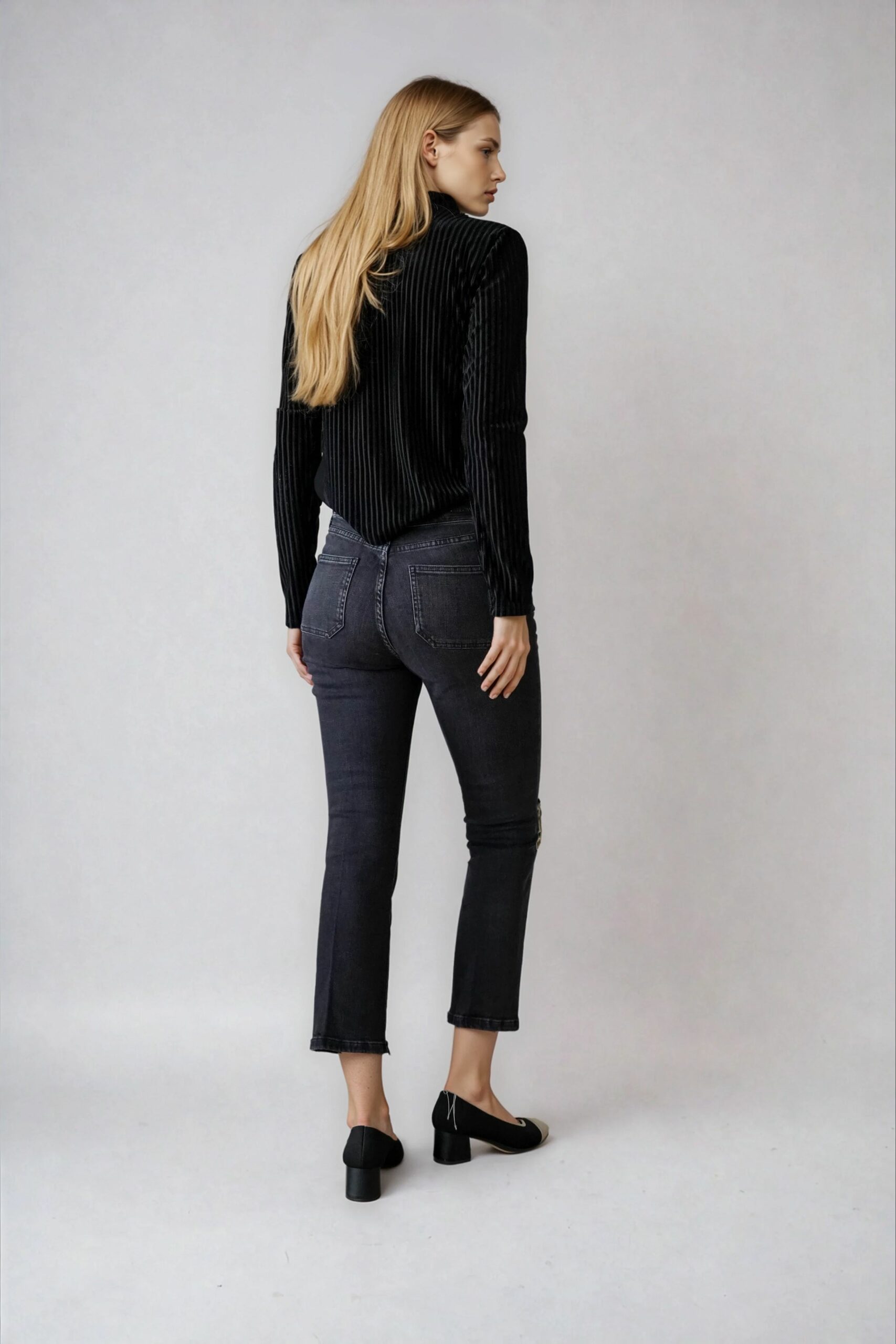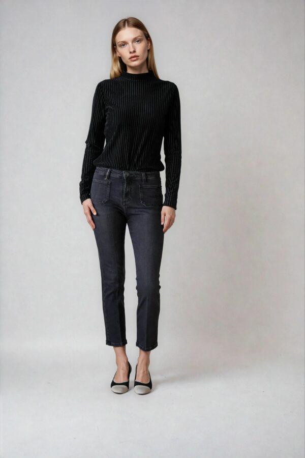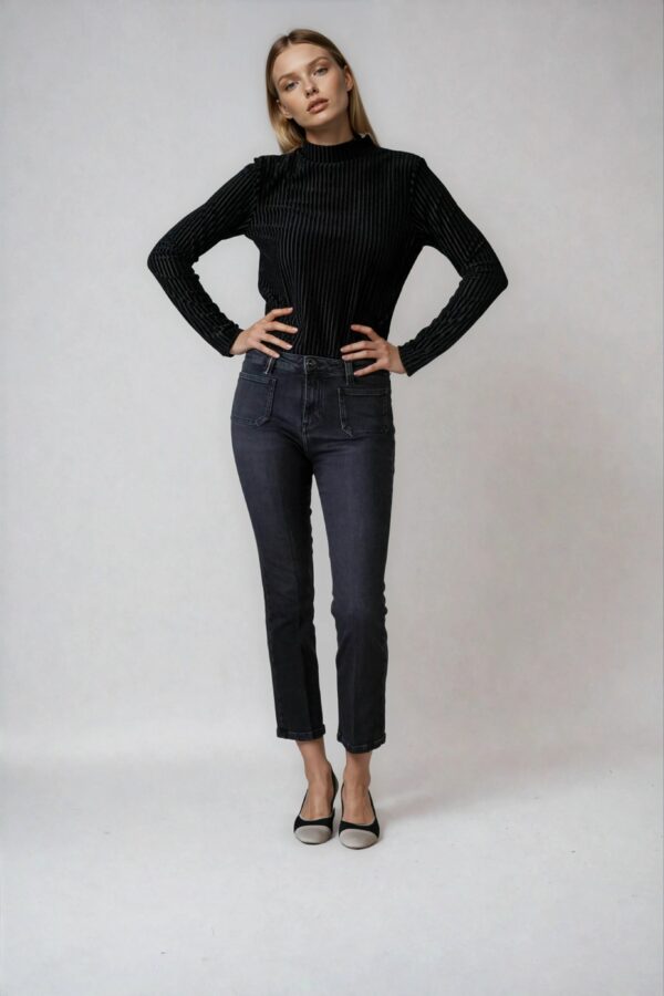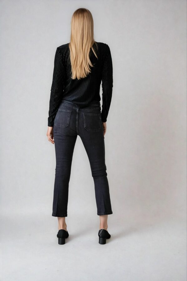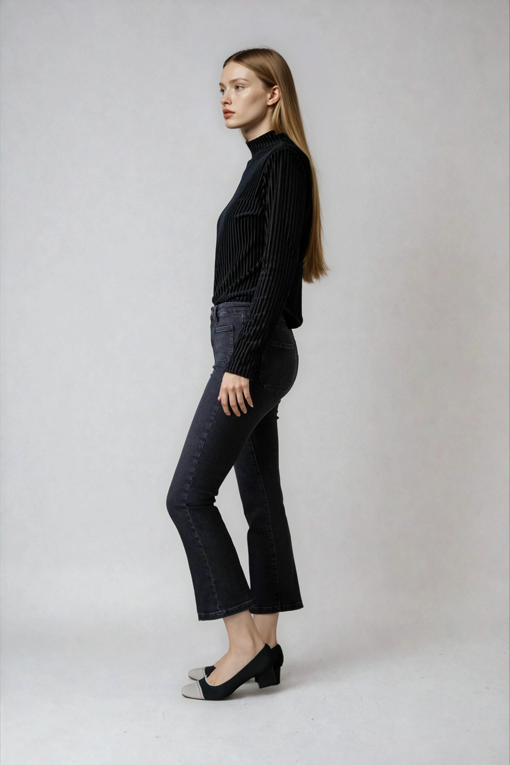 Pantalon coupe flare. Taille Haute, poches plaquées. Longueur entrejambe 65 cm.